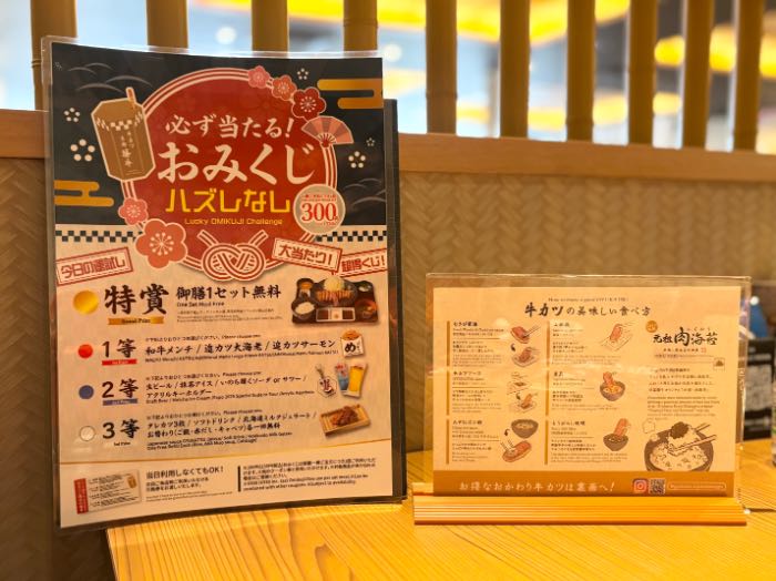 お膳を注文すると抽選できる、必ず当たる!おみくじハズレなし、330円で挑戦可能で、3等でもタレカツやミルクジェラートなどから選べる何ともお得なおみくじ、特賞は御膳1セット無料!当たった引き換え券は別日利用も可能