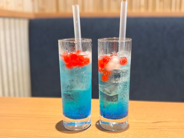 飲んでみたかったお目当てのドリンク、大阪・関西万博店限定ドリンク、万博カラーの青と赤が可愛らしい「いのち輝くサワー」「いのち輝くソーダ(ノンアルコール)」、ライチとベリーの爽快感を味わえるドリンク、大阪・関西万博公式ライセンス商品のミャクミャクのぬいぐるみを持参されて、スタッフの方に見せるとこちらのドリンクがサービスでいただけるというお得なサービスがあるそうです!