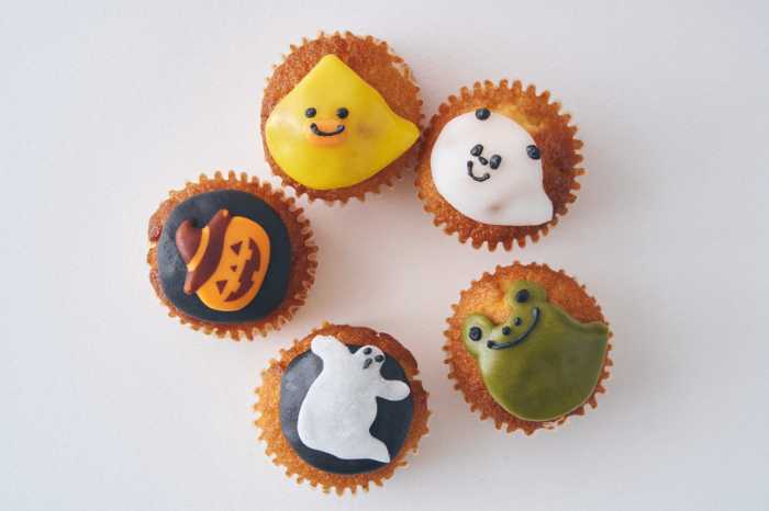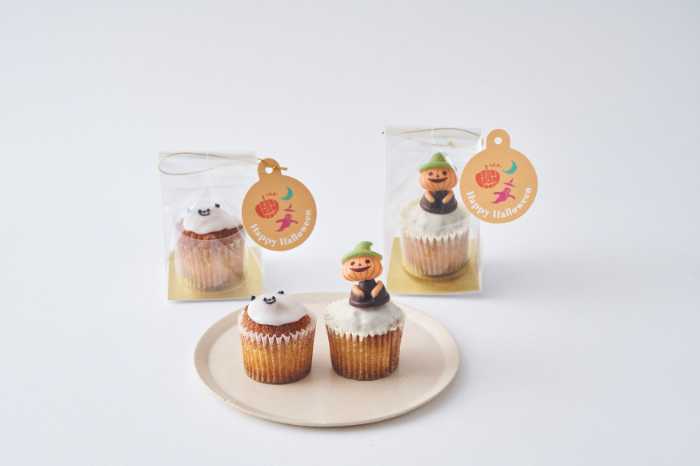 「おばけパンダカップケーキ」(600円)は愛らしいバニラアイシング仕立て、「ハロウィンパンプキンくんカップケーキ」(650円)はチョコのパンプキンがポイント♡