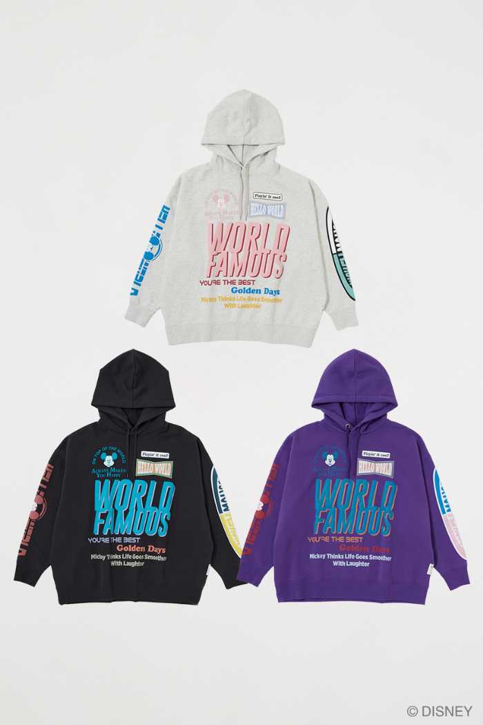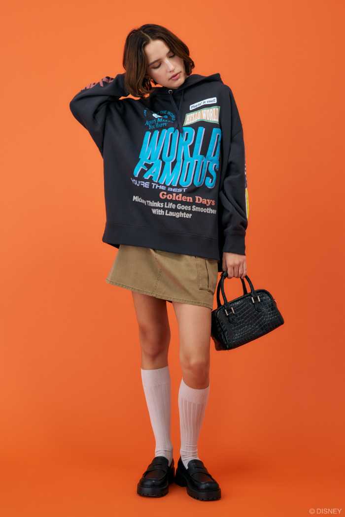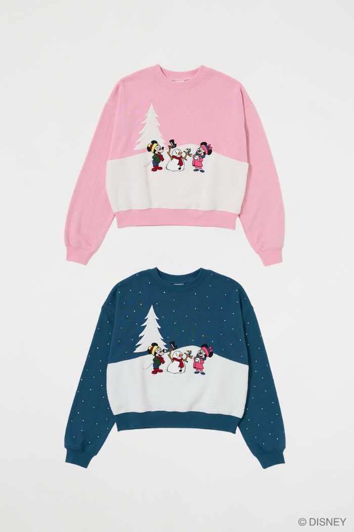 MICKEY & FRIENDSからは、雪をボア素材やラインストーンで表現したスウェット、スポーティーなロゴと大胆なプリントが目を引くフーディなどが登場です。