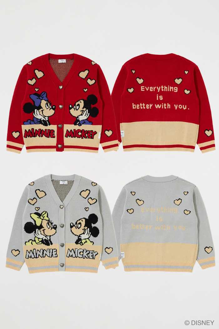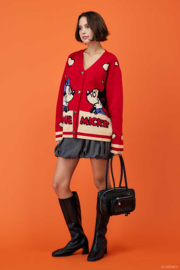 また、ミッキーとミニーが寄り添う姿をレトロに編み込んだニットカーディガンなども。ハート型のボタンが遊び心を添え、着るだけで気分が高まります。