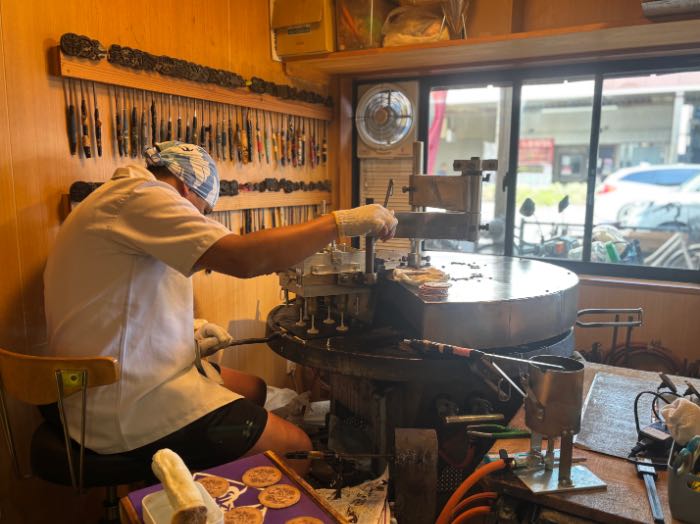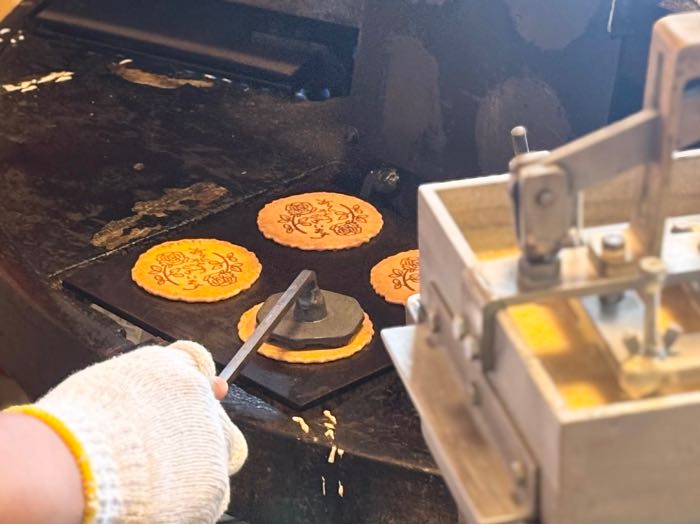 明石最古の煎餅屋 手焼きにて焼かれていくお煎餅