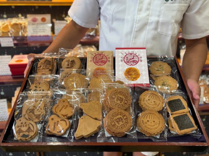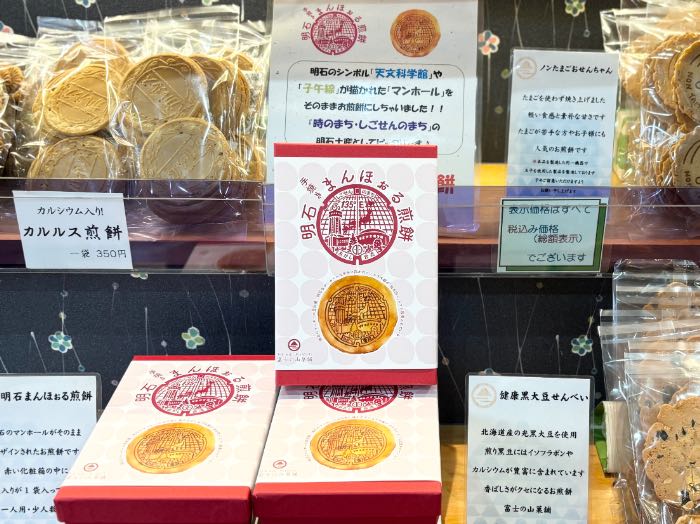 明石のシンボルといえば、「天文科学館」や「子午線」、マンホールのデザインにも描かれている「天文科学館」や「子午線」をマンホールごと、お煎餅にした「明石まんほぉる煎餅」も販売されており、明石土産にもぴったりです。