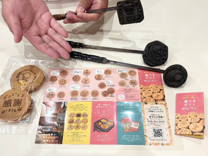 オリジナルのお煎餅も受注販売されており、お祝い事やノベルティとして、デザインからこだわりたい方へは約三週間で自身でイラストデザインしたものを焼印として使用できる、フルオーダーも可能、店主が一枚一枚丁寧に焼印を入れてくれるので、気持ちがこもった贈り物にも最適