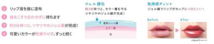 「ハグマイリップ」は、唇に塗って約3分待つことで透明ジェル膜を形成。つけたての発色を守りながら、色移りしにくい仕上がりを叶えます。