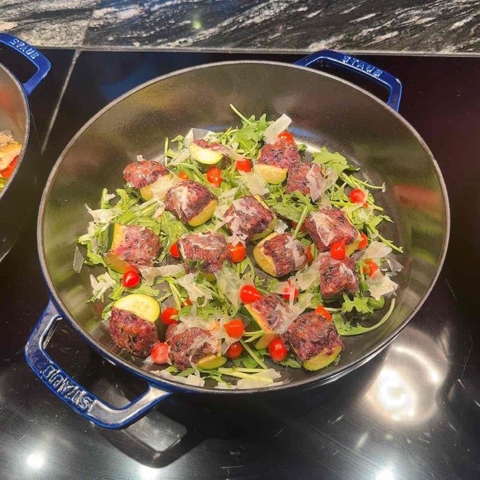 イタリア産ズッキーニに黒米を詰め、彩り豊かなルッコラや赤いスイートペッパーと合わせた一皿。ほどよい食感と香ばしさが広がり、野菜の旨みを堪能できます。