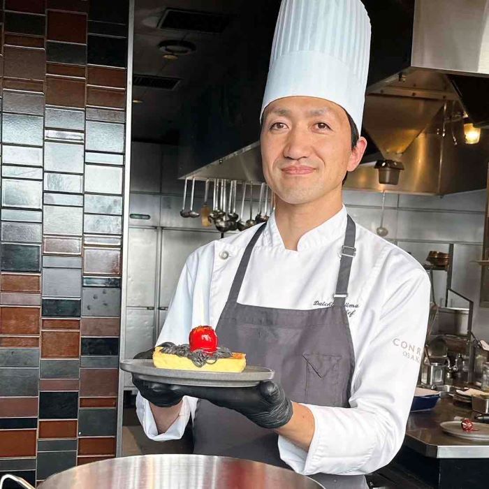 2022年よりコンラッド大阪で活躍する児島大貴シェフは、西日本洋菓子コンテストでの受賞歴を持つ実力派。繊細な技術と遊び心を融合させ、妖艶なスイーツビュッフェ「The Villain(ザ・ヴィラン)」を監修しています。
