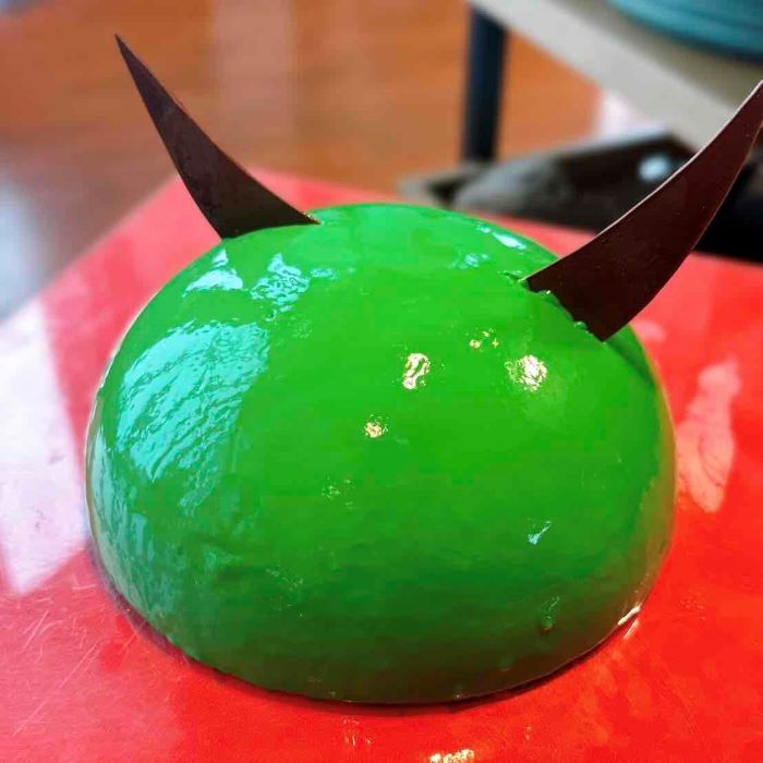 妖しく輝くグリーンのグラサージュにチョコレートの角を飾った、存在感抜群のケーキ。中にはイチゴのムースとイチジクのコンポートが隠され、甘酸っぱさと奥行きのある甘みが広がります。悪役の名を冠した名にふさわしく、妖艶さと美味しさを兼ね備えた一品です。