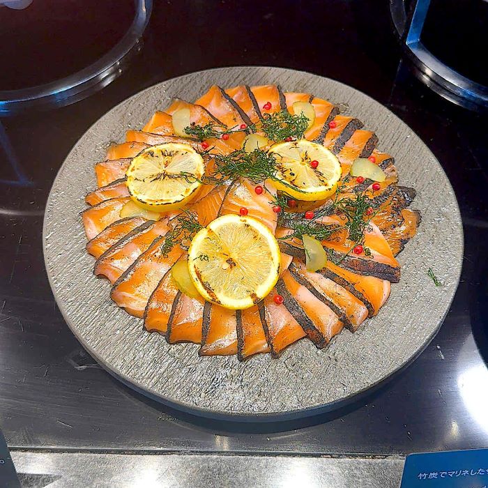 とろけるように滑らかなサステナブルサーモンを竹炭でマリネし、香ばしさと旨みを引き出した一皿。レモンとピンクペッパーを添えて花びらのように盛り付けられた姿は、お花のように華やかで、テーブルを彩ります。