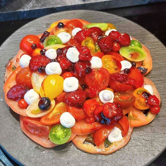 鮮やかな赤や黄のトマトを重ね、お花のように盛り付けた華やかな一皿。トマトのフレッシュな酸味に、ベリーの甘酸っぱさとリコッタチーズのまろやかさが合わさり、爽やかなおいしさが広がります。