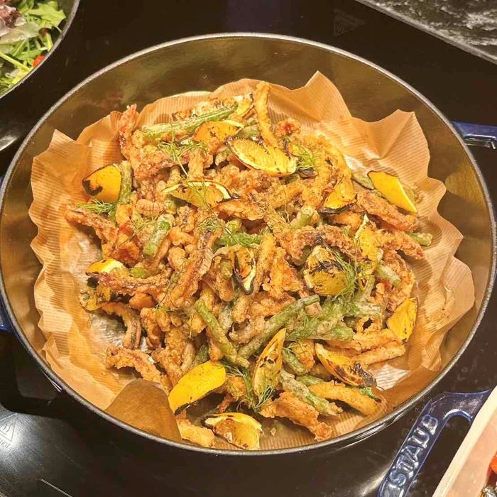 サクッと香ばしい衣をまとったイカのフリットに、炭塩の旨みと焦がしレモンの酸味が重なり、軽やかな美味しさが魅力です。