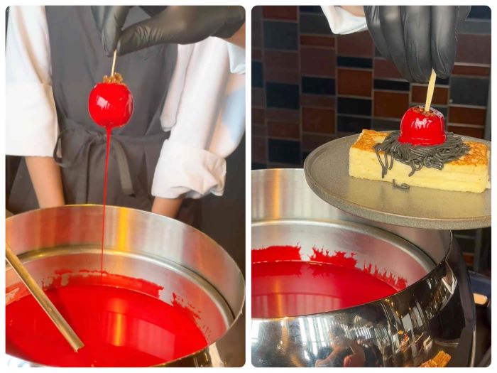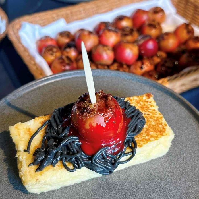 焼き立てのフレンチトーストに、漆黒のモンブランと真紅の姫リンゴを飾る一皿。シェフが目の前で仕上げる演出は、まるで禁断の果実を差し出されるようなスリルを感じさせます。