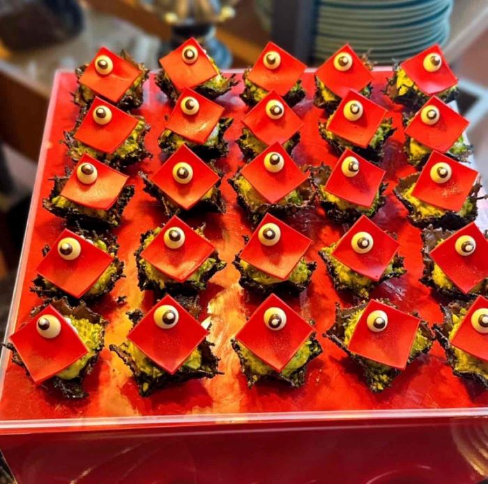 鮮やかな赤いチョコレートの下に隠れているのは、濃厚なかぼちゃの甘みと香ばしいピスタチオ。鋭い眼差しのようなデコレーションが印象的で、まるでこちらを見つめる小さなモンスターのよう。ユーモラスでありながらも、一口ごとに広がるかぼちゃの優しい甘さとピスタチオの風味が調和し、見た目とのギャップに驚かされる美味しさです。
