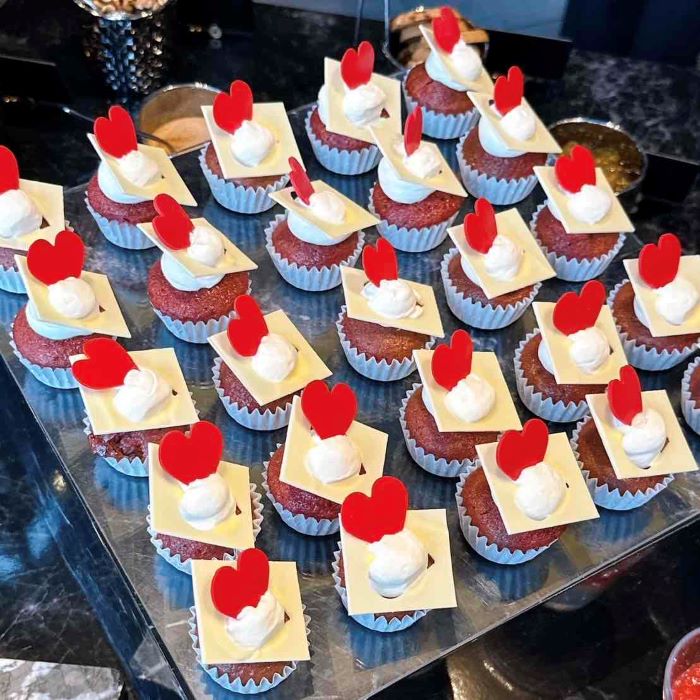 真っ赤なハートと純白のクリームが飾られた一口サイズのケーキは、「ハートの女王」を思わせる存在感。しっとりとした赤いマフィン生地に軽やかなクリームが重なり、見た目の華やかさに反して口あたりは優しく、甘さも上品。可愛らしさの中に、女王の強烈な支配力を感じさせるような一品です。