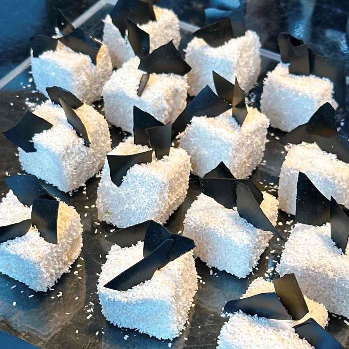 白いココナッツをまとった小さなケーキに、黒のチョコレートを飾り、ダルメシアン模様を表現。クルエラの冷酷さを思わせる姿ながら、口に運べばふんわりと軽い食感でやさしい甘さが広がります。シンプルな見た目に潜む美味しさが、物語の裏側を覗くような余韻を残します。