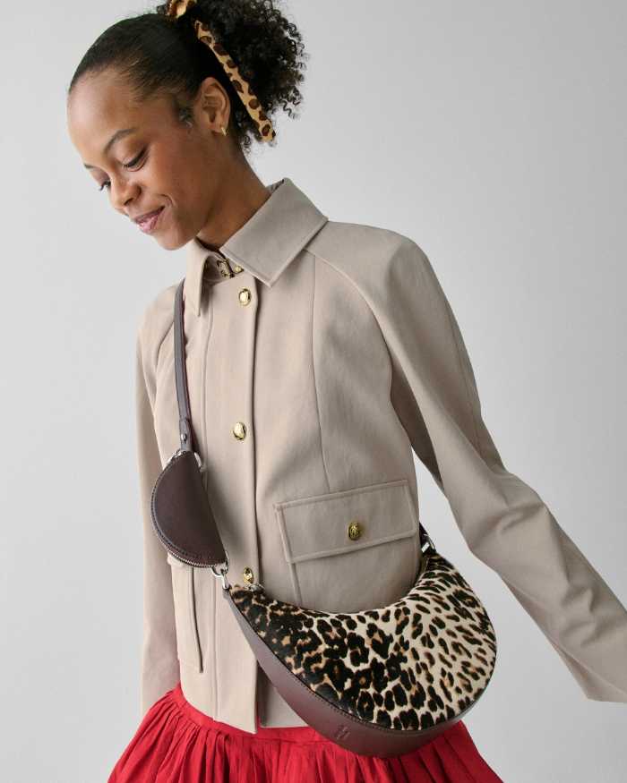 「ケーエスデュオ ダウンタウン レオパード ヘアカーフ クロスボディ バッグ」は、毛足のあるヘアカーフ素材とクラシックなレオパード柄が特徴。