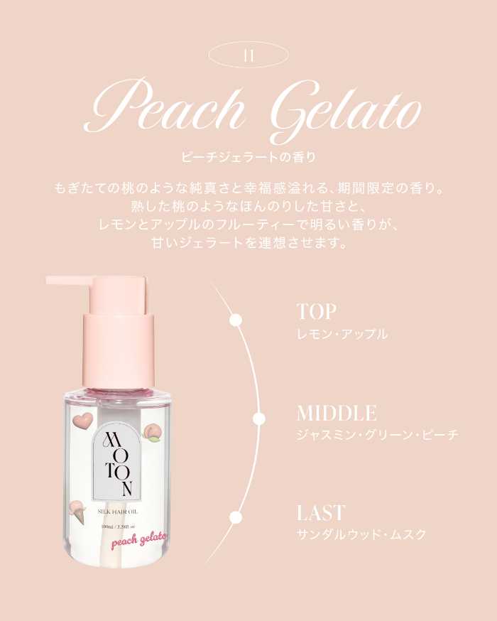 髪も肌も香りも、すべてを満たすMOTONの数量限定コレクション。シルクヘアオイルの「ピーチジェラート」は爽やかで甘い香りが広がり、毎日のヘアケアを幸せなひとときにしてくれます。