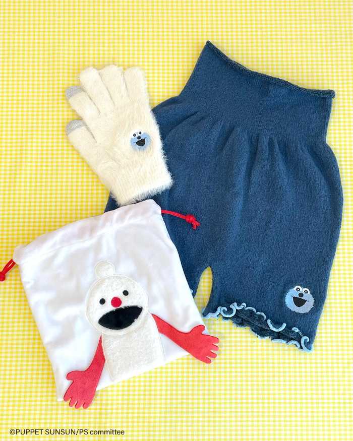 寒い季節に活躍する「手袋」「ウエストウォーマー」「ふわふわ巾着」は各390円(税込429円)。シンプルなデザインに、スンスンやノンノンのワンポイント刺繍が施され、大人でも取り入れやすいのが魅力です。