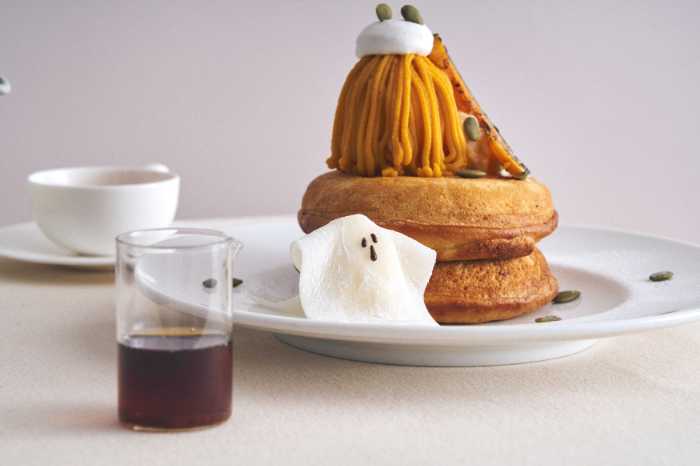 “おばけ”アイスが遊び心を添える〈北海道産かぼちゃとメープルカスタードのハロウィンパンケーキ〉は、まさに今だけのご褒美スイーツです。