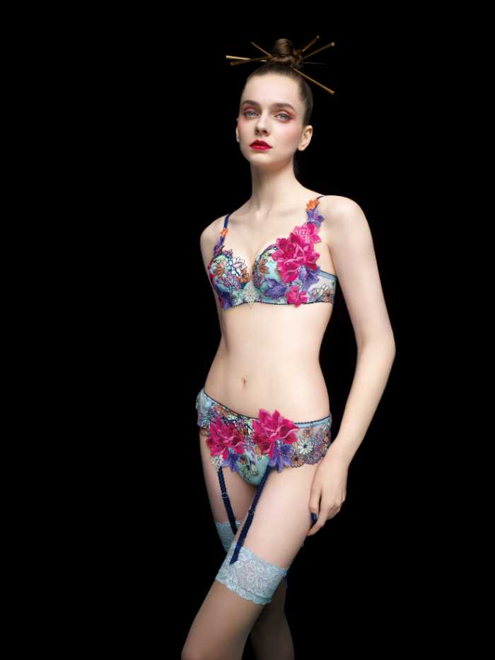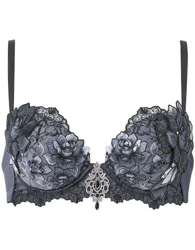 プッシュアップブラは脇から中央へバストを寄せ、美しい谷間を演出。雫のように輝くスワロフスキー・クリスタルや繊細なグラデーションのバラモチーフがオリエンタルなムードを漂わせます。