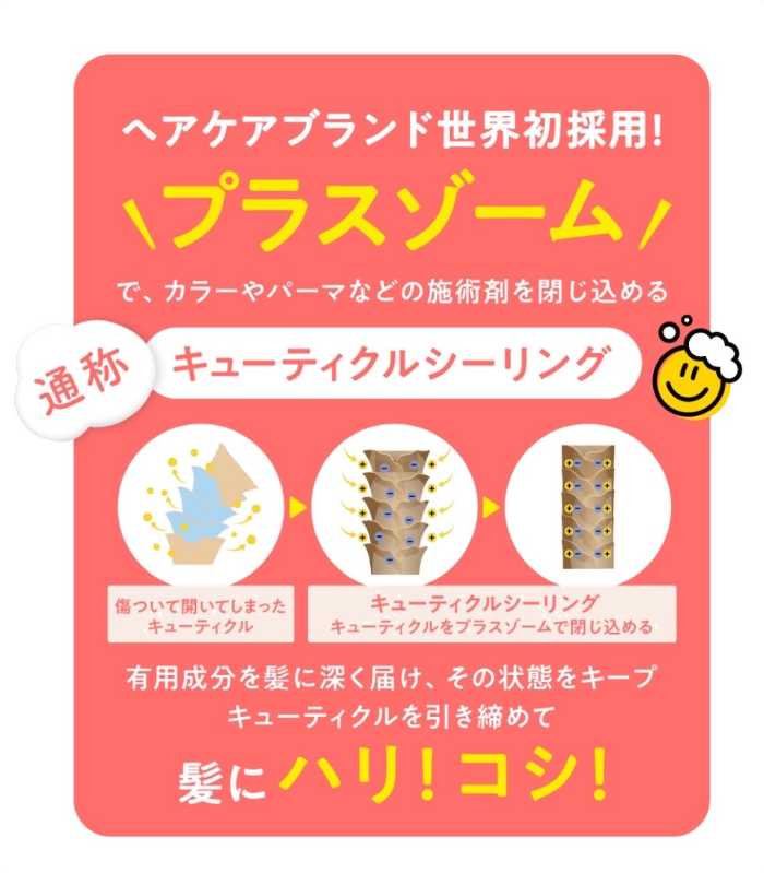 髪のキューティクルを保護し、開いた部分を満たして閉じ込める“キューティクルシーリング”の働きで、カラーの退色やパーマの持ちをサポートします。