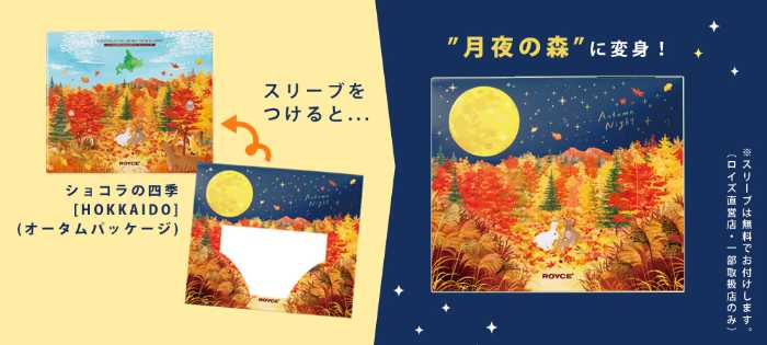 北海道の秋景色を描いた「ショコラの四季HOKKAIDO」に、期間限定スリーブが登場。月明かりに照らされた秋の夜空をイメージした特別デザインは、お月見気分を高めてくれます。