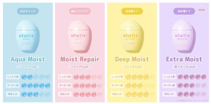 ブルーは爽やかなアクアモイスト(うるサラ)、ピンクはモイストリペア(うるツヤ)、イエローはディープモイスト(うるうる)、パープルはエクストラモイスト(超※2うるうる)仕上がりに。