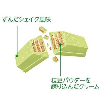 ウエハースの間に枝豆パウダー入りのサンドクリームを挟み込み、香り高い枝豆の風味を再現しています。