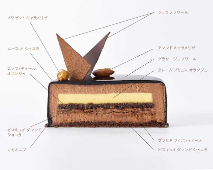 今回登場する『Envol』は、なめらかなムース オ ショコラに、オレンジ風味のクレームブリュレを重ね、フィアンティーヌやビスキュイを組み合わせたアントルメ。