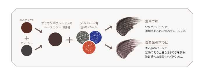 大粒のシルバー・青・赤パールが光を集め、室内では透明感のある深みグレージュ、自然光では温もりのあるブラウンへ変化。まつげを重くせず、立体感とツヤ感を演出します。