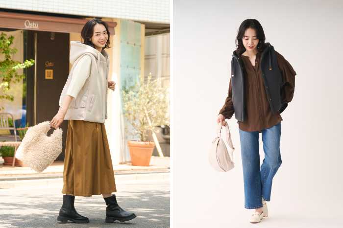 「ダンボールコンビフードベスト」はフリーサイズで、肩幅37cm・身幅104cm・着丈64cm・裾幅118cm。カラーはベージュとチャコールグレーの2色展開で、秋のコーディネートに合わせやすいのも魅力。