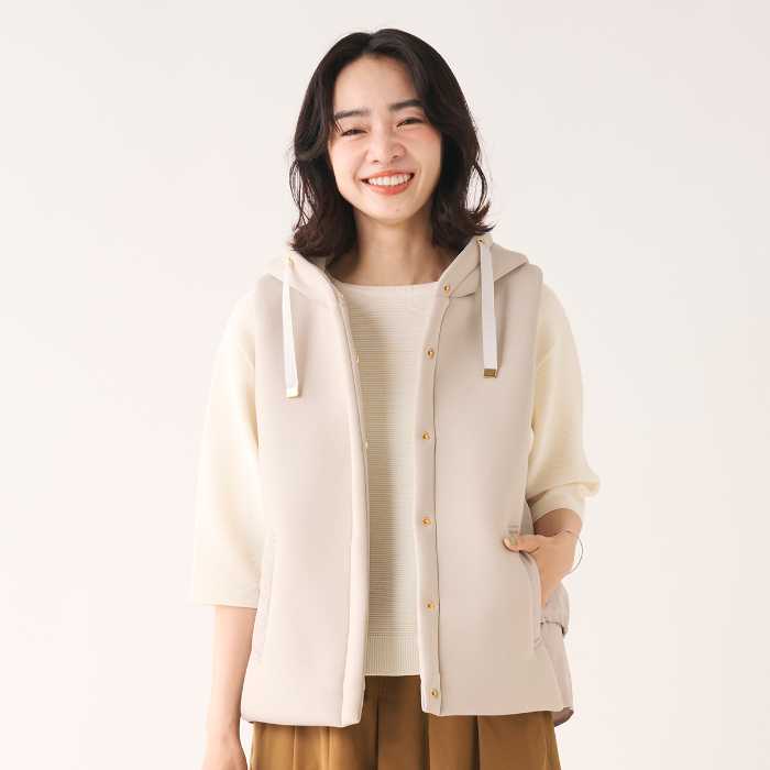 KEYUCAの「ダンボールコンビフードベスト」は、立体感のあるシルエットと大きめ襟、裾の絞り仕様で女性らしさを引き立てる一枚♡