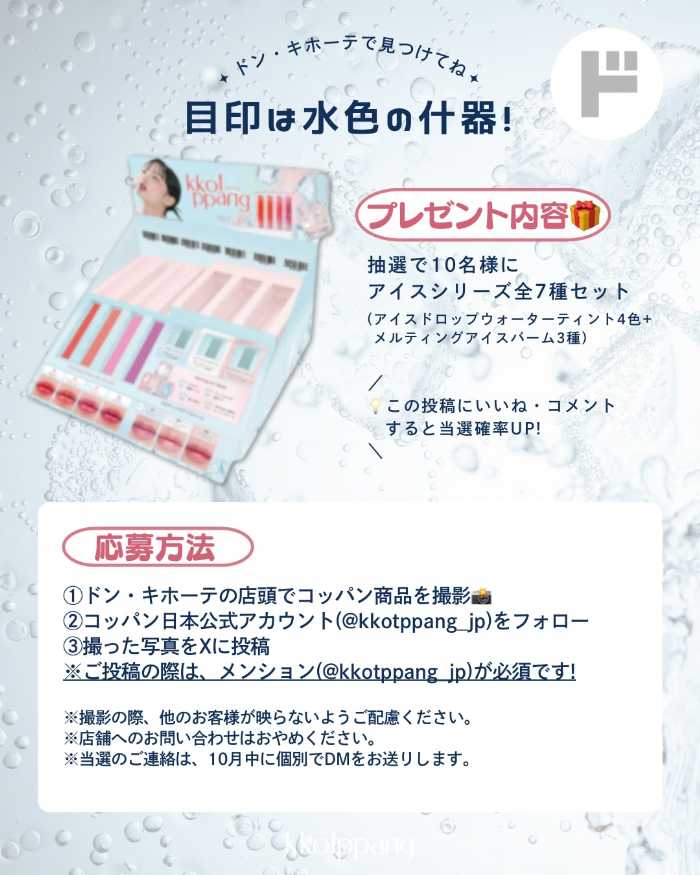 韓国コスメ好きの間で話題のプチプラブランド「コッパン」が、ついに全国のドン・キホーテに登場!これまでQoo10公式ショップ限定だった人気アイテムが、オフラインで手に取れるようになります。今回発売されるのは、花茶カラーが魅力の「アイスドロップウォーターティント」全4色と、氷型ケースが可愛い「メルティングアイスバーム」全3種。新しい出会いに胸が高鳴りますね♪