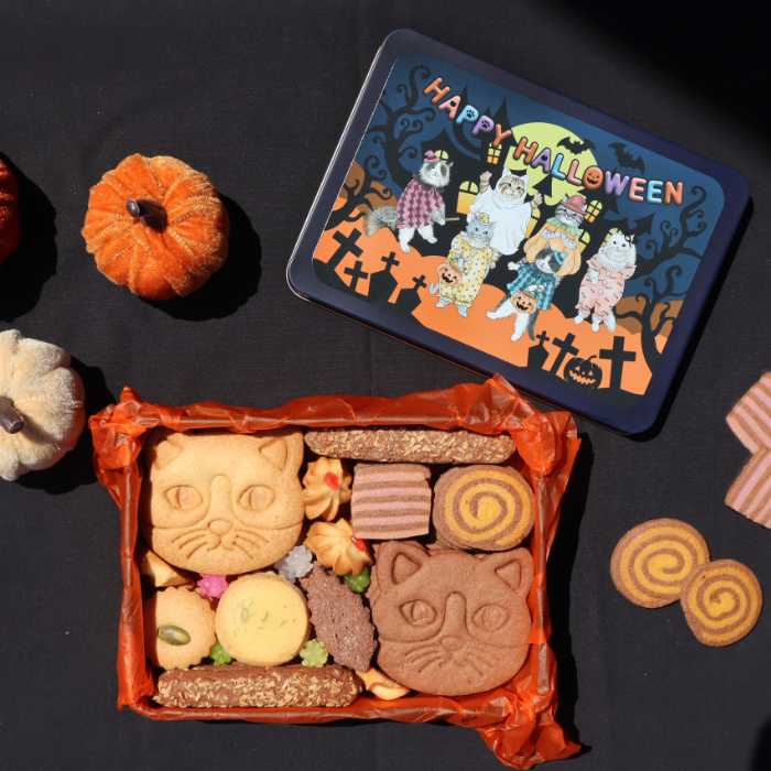 ハロウィン仕様のクッキー缶は、ふたを開けると大きな猫顔クッキーが登場♪周りには6種類の職人手作りクッキーと金平糖を詰め合わせています。