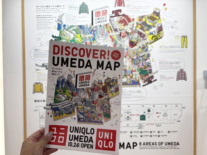 「DISCOVER UMEDA MAP」は、梅田の街を「うめきた」「大阪駅」「茶屋町」「中崎町」「お初天神」「北新地」「ダイヤモンド」「西梅田」の8つのエリアを表記しており、「UNIQLO UMEDA」では、梅田の街並みと売場がコラボレーション。