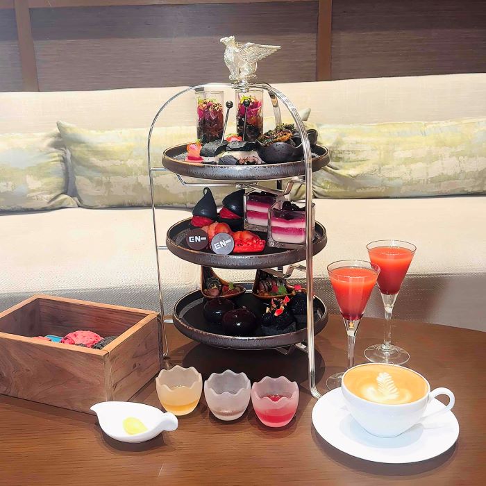 JWマリオット・ホテル奈良の1階「LOUNGE & BAR FLYING STAG」では、10月1日から11月30日までの期間限定で「EN-CHANTED BITE」を提供中。ENHYPENの“ヴァンパイア”コンセプトをモダンに表現!スタンドには漆黒と深紅を基調にしたスイーツやセイヴォリーが並びます。「1ミシュランキー」を獲得した洗練されたホテルで、ミステリアスな秋の午後をお楽しみください。