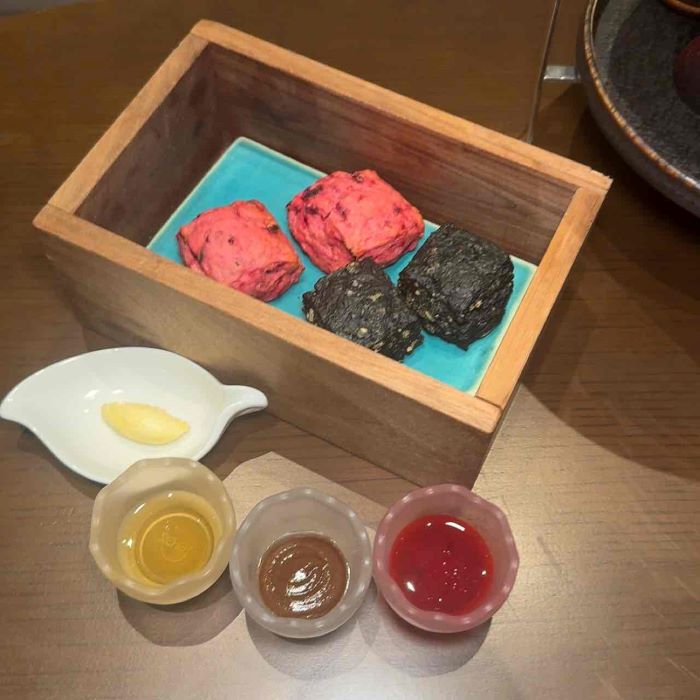 ビーツとクランベリーを練り込んだスコーンは、鮮やかな紅色とほのかな甘酸っぱさが魅力。ブラックの岩海苔スコーンは香ばしく、塩味の余韻が紅茶にもぴったり。ローズヒップティーのコンフィチュールや黒蜜・ピーナッツバターのスプレッドと合わせて、異なる風味のコントラストを楽しめます。