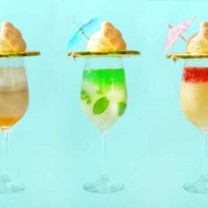 ブランマンジェの上に、白ワインのジュレと優しい甘さのミルクアイスが重なり、可愛らしい蜂のクッキーと花をあしらった華やかな見た目。