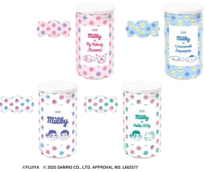 注目は「ミルキー缶(サンリオキャラクターズコラボ’25)」(880円)。全4種類の限定デザイン缶にはミルキーが9粒入り、同柄のステッカー付き。