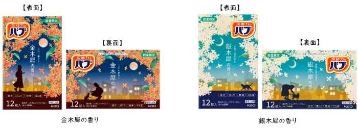 「バブ 金木犀の香り」はノスタルジックイエロー(色つき透明)、「バブ 銀木犀の香り」はディープナイトブルー(色つき透明)の湯色で登場。内容量は40g×12錠入りで、価格はオープン価格。
