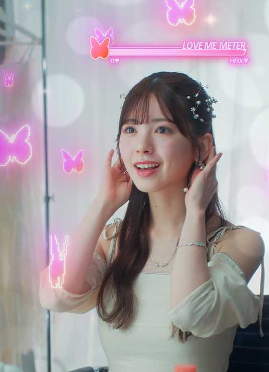 本番前の楽屋で不安そうな筒井あやめさんも、マトメージュまとめ髪アレンジウォーター(825円・100mL)で髪を巻くと、“LOVE ME METER”が徐々に上昇♡