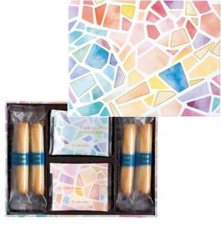 『ガトー アミカル』の缶は、お菓子の形をモチーフにしたモザイクタイル柄をやわらかな光と水彩で表現。