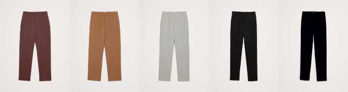 すっきりと穿ける「ハイライズ スリム イタリアンウール アンクルパンツ」(20,000円)とゆとりを持たせた「ハイライズ モダンストレート イタリアン ウールパンツ」(20,000円)。