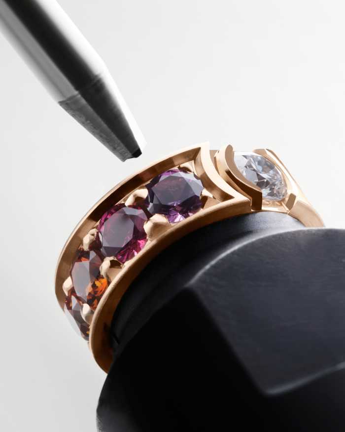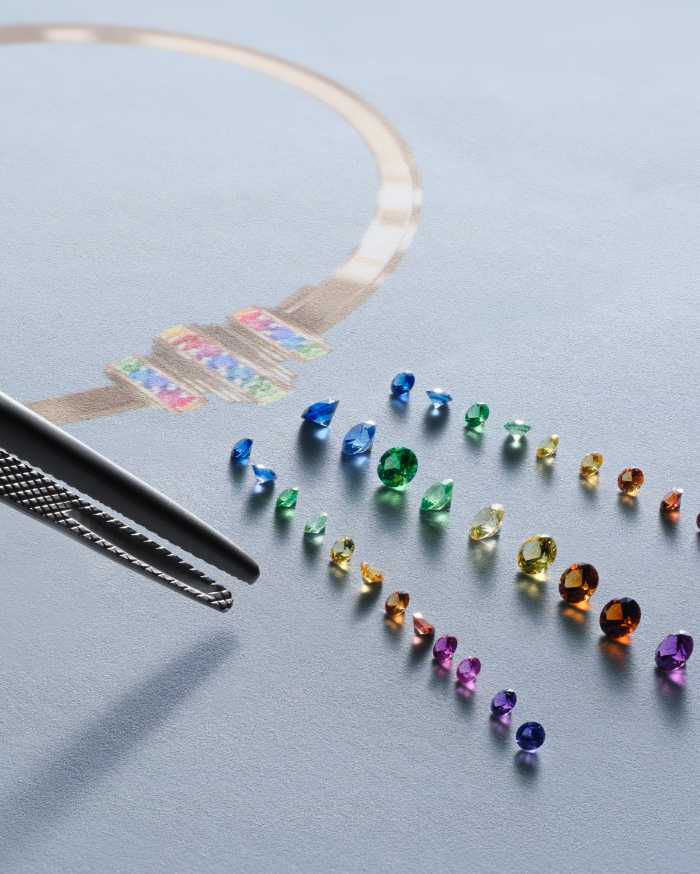 「ポセション レインボー」シリーズは、ダイヤモンドやサファイア、ルビー、ツァボライトなど、宝石を丁寧にセッティングし、虹色のグラデーションを実現。