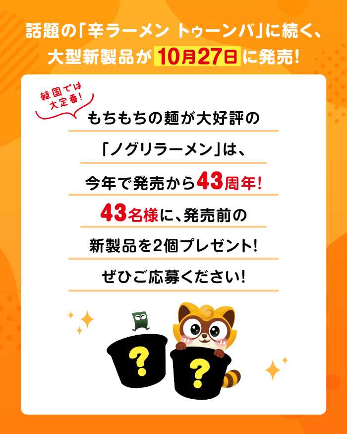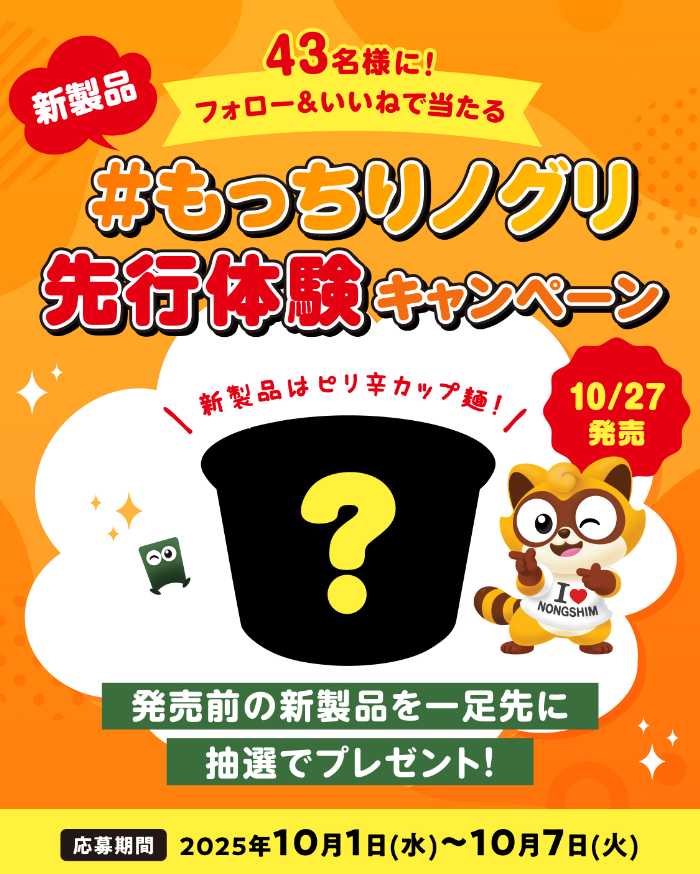 韓国で43年の歴史を誇る人気ラーメン「ノグリ」シリーズから、日本初のレンジ調理対応カップ麺「もっちりノグリ(仮名)」が新登場!鍋で煮込んだようなもちもち食感をカップで手軽に楽しめる新感覚インスタント麺です。発売前にはSNSキャンペーンも実施され、抽選で合計129名に先行体験のチャンス♡ノグリファンもラーメン好きも見逃せない注目作です。