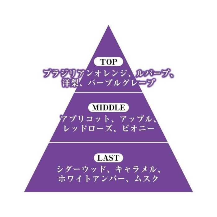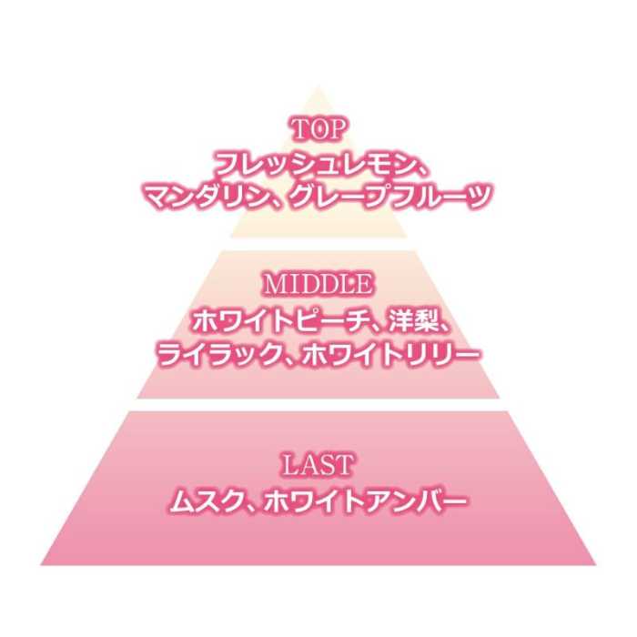 レモンやグレープフルーツの爽やかなトップから始まり、ホワイトピーチや洋梨の甘さに、ライラックやホワイトリリーの華やかな花々が重なります。