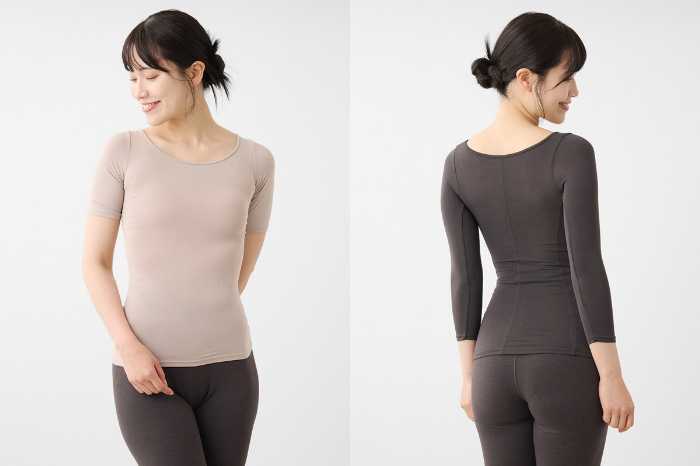 グレーベージュとチャコールグレーの2色展開。透けにくく、オフィスやお出かけシーンでも上品に着こなせます。半袖は2,970円(税込)、8分袖は3,630円(税込)で秋冬コーデにも活用可能です♪