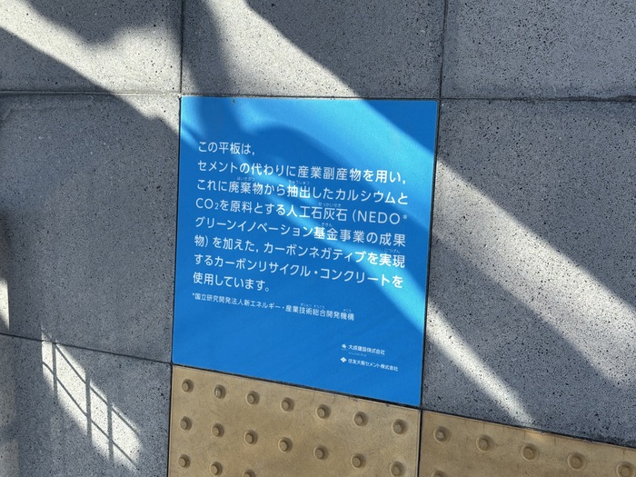 見学の際に歩いていたコンクリートも、廃棄物から抽出した二酸化炭素を原料とした、カーボンネガティブを実現するカーボンリサイクル・コンクリートを使用!何気なく歩いていたコンクリートまで地球に優しい原料で作られるとは、未来への期待が高まります。
