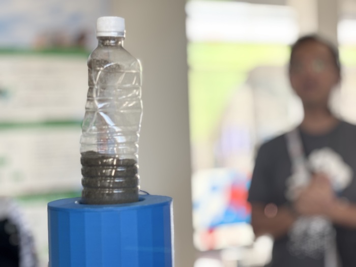 二酸化炭素を吸収するコンクリートの実験では、コンクリートの素材となる路盤材をあらかじめ入れてあるペットボトルに二酸化炭素を注入すると、コンクリート素材はどんどん二酸化炭素を吸収し、ペットボトルは押しつぶされるように凹みました。