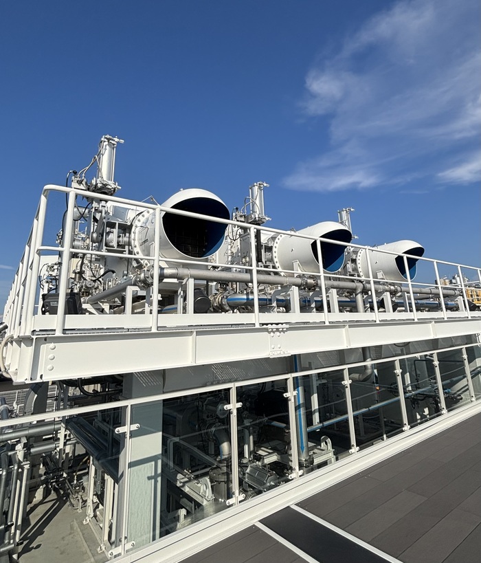 2階にあがって目の前に現れるのは巨大なDACという装置、大気中の二酸化炭素を回収し、e-メタンとして利用します。e-メタンは、都市ガスの原料となり、世界中で注目されている、地球温暖化対策革新的な技術です。